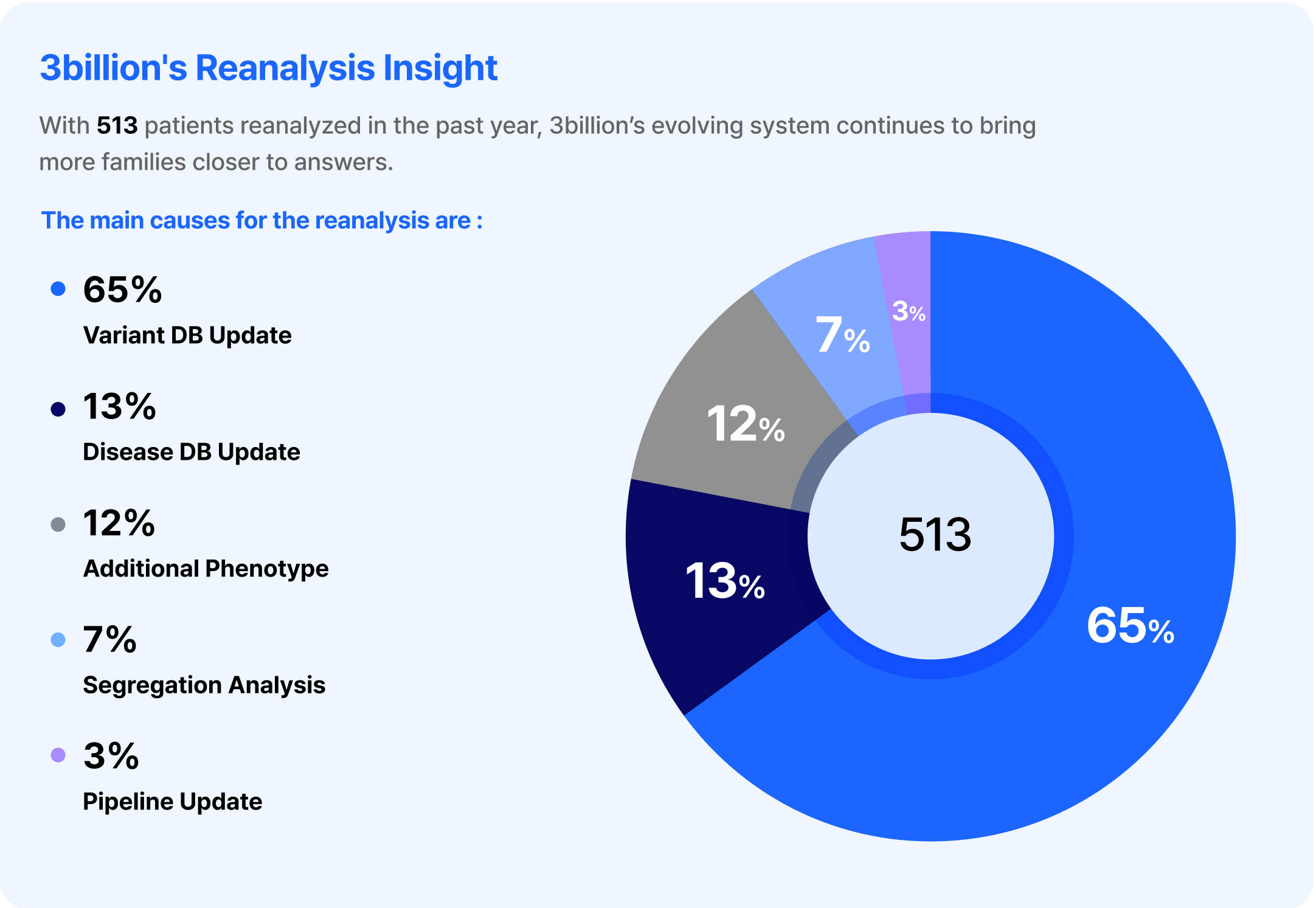 Through 3billion’s regular reanalysis, all six patients were later found to share the same deletion in the HNRNPA1 gene (exon 10). What was once a negative result became a clear diagnosis, giving their care teams a new path forward.